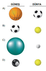 Güneş ve Dünya’nın büyüklüğünü model üzerinde göstermek isteyen bir öğrenci, farklı cisimler arasında tercih yapmaya çalışmaktadır.