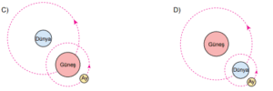 Verilen bilgilere göre Güneş, Dünya ve Ay’ın birbirlerine göre hareketlerini gösteren modellerden hangisi doğru çizilmiştir?