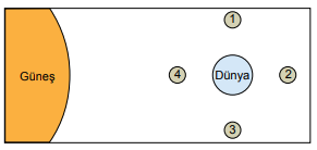 Buna göre Ay’ın gözlemlenen evrede olabilmesi için şekildeki numaralanmış konumlardan hangisinde olması gerekir?