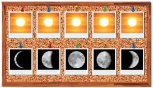 Bir ay boyunca her gün öğle ve gece aynı saatlerde Ay ve Güneş’i fotoğraflayan bir öğrenci bunlardan bazılarını kullanarak şekildeki posteri oluşturuyor.