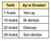 Aşağıdaki tabloda Ay’ın bazı evreleri ile ilgili bilgiler verilmiştir.